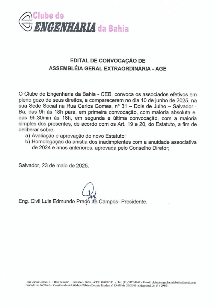O Clube de Engenharia da Bahia (CEB) convoca todos os associados efetivos, em pleno gozo de seus direitos, para participarem da Assembleia Geral Extraordinária (AGE), que será realizada no dia 10 de junho de 2025, na Sede Social, localizada na Rua Carlos Gomes, nº 31 – Dois de Julho, Salvador-BA.