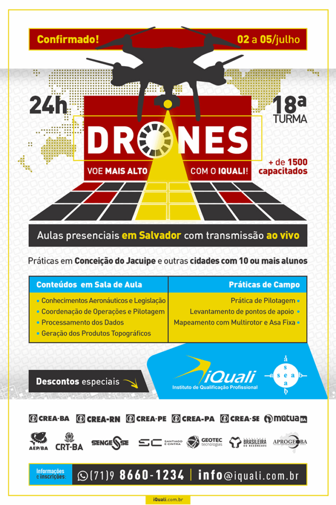 O Instituto de Qualificação Profissional (iQuali) confirma a 18ª turma do Curso de Drones, para o período de 2 a 5 de julho. A capacitação oferecerá aos alunos aulas teóricas, em Salvador, e práticas, em Conceição do Jacuípe e outras cidades. Profissionais adimplentes ao Conselho Regional de Engenharia e Agronomia da Bahia (Crea-BA) terão 25% de desconto no curso completo.
